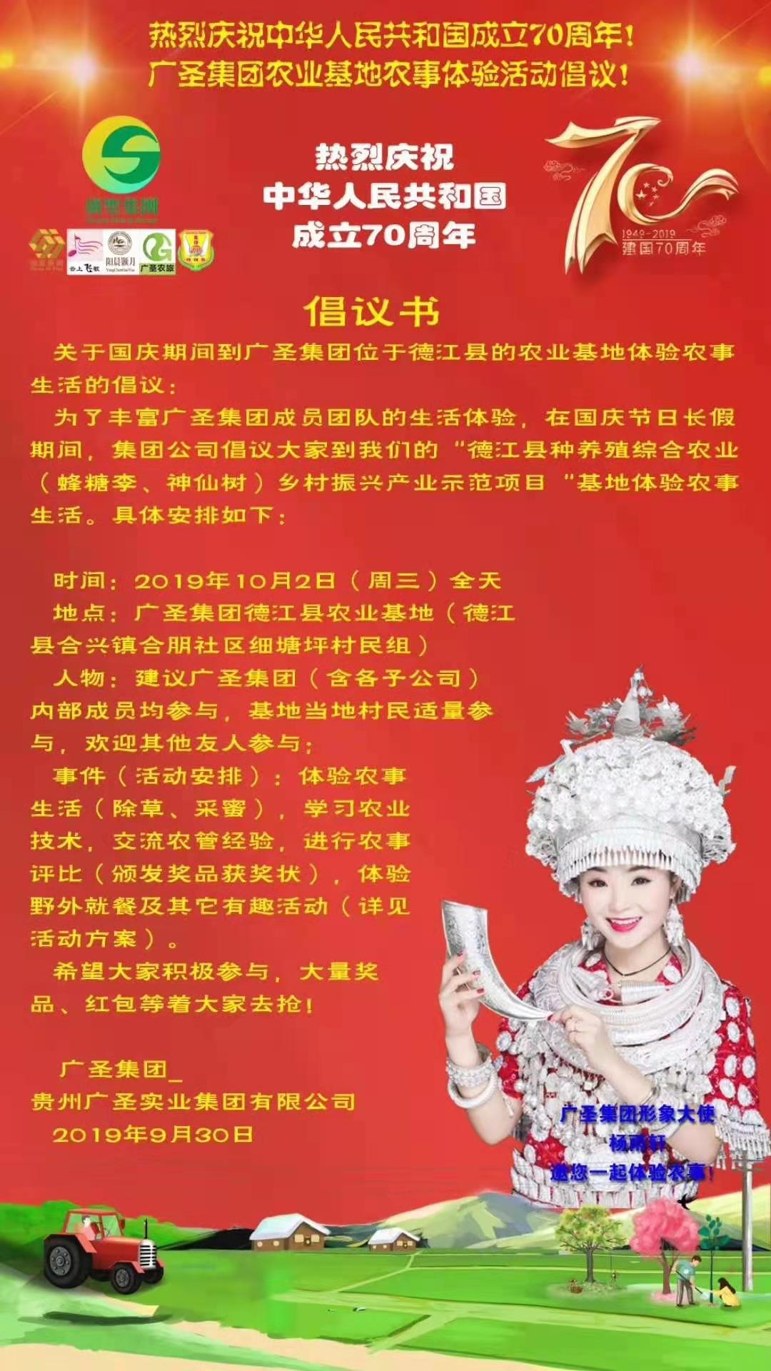 2019年10月2日,广圣集团全体主要成员前往广圣集团_贵州广圣生态农业旅游有限公司位于德江县合兴镇的“德江县种养殖综合农业(蜂糖李、神仙树)乡村振兴产业示范项目”基地开展农事体验活动,参与人员有广圣集团主要负责人、基地负责人、当地村民、村委会负责人、邀请参加的友人,体验活动主要内容有:1、农事体验(除草、施肥、农技、采蜜);2、农技学习(除草,施肥,蜂糖李“六枝”管理——剪枝、修枝、拉枝、吊枝、扭枝、松枝,病虫害、旱涝、种植、选苗、养蜂技术。采蜜技术等);3、农管经验(园区整体管理经验交流);4、农事帮扶(对除草的人员赠送大米每人一袋);5、野炊体验(野外体验土家族刨汤肉、酸汤豆腐、青椒啤酒鸡、木甑子蒸饭、打糍粑等)。